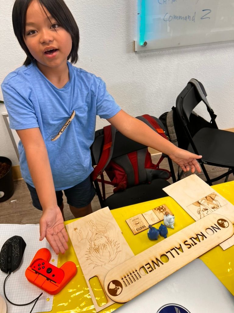 "My favorite thing about 3DMAKERCAMP was 3D printing. I could print what ever I wanted and it was fun! This helped me grow and learn by working with computers and learning new skills and more cool stuff. Also it is not just 3D printing or laser cutting. You also meet new people can also play different types of games (outside/inside:)"
